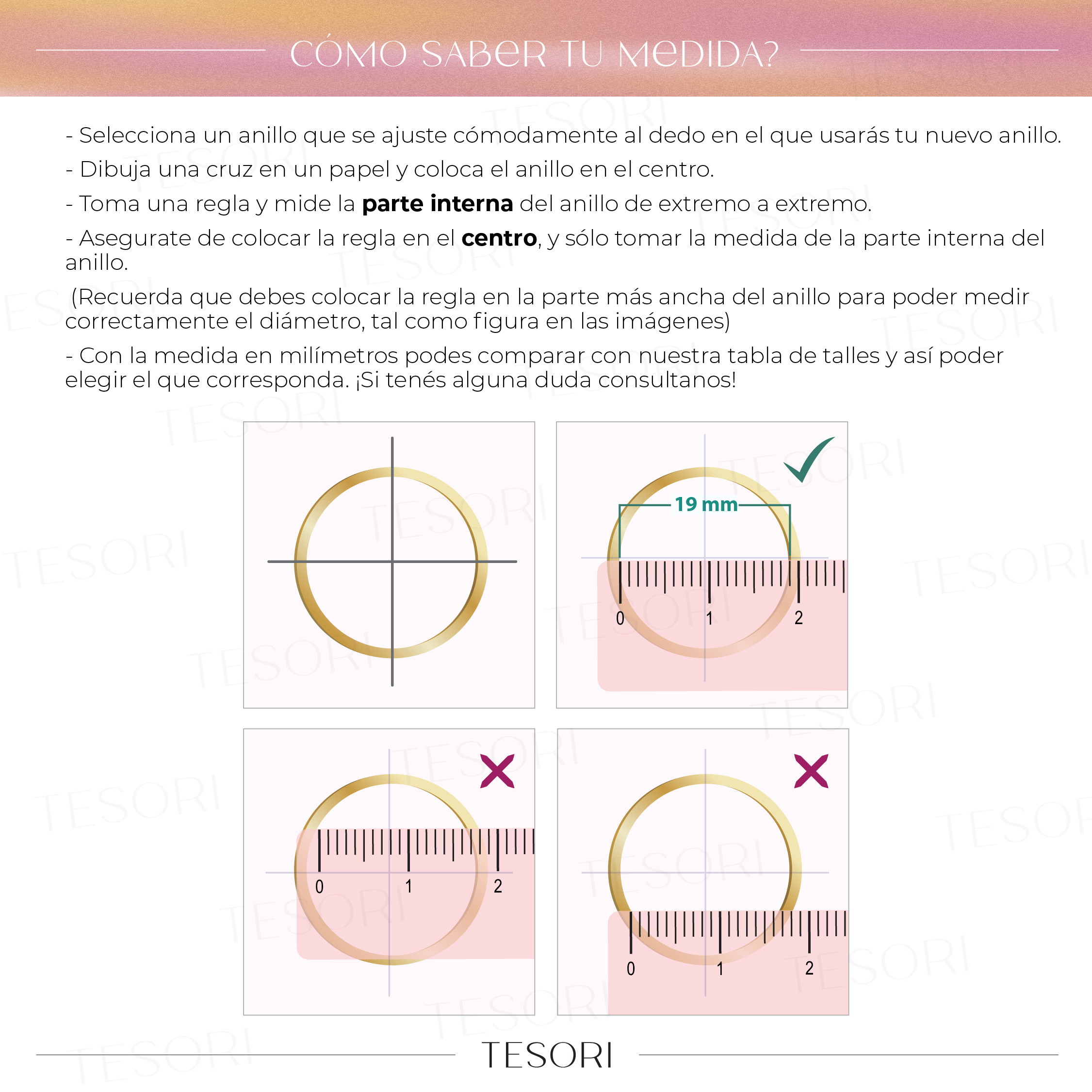 Si tenés un anillo que te quede bien, toma una regla y mide el diámetro en la parte más ancha del circulo. Sería exactamente en el centro del circulo INTERNO del anillo, así podrás ver cuantos milímetros tiene para comparar con nuestros talles.